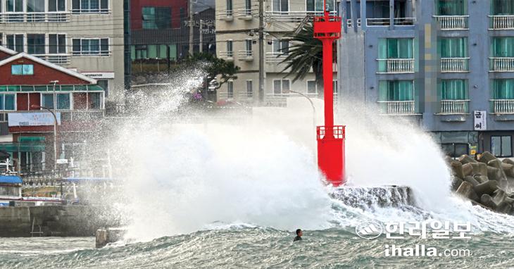 제주 전 해상에 풍랑주의보가 내려진 3일, 제주시 이호포구에 높은 파도가 해안으로 밀려오고 있다. 강희만기자