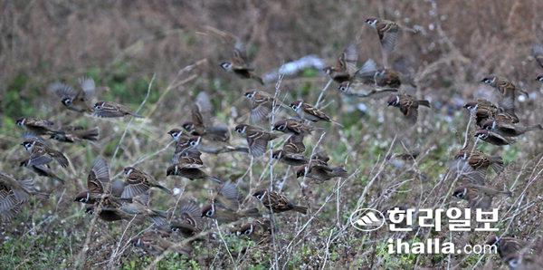 [한라일보] 겨울나기 앞둔 참새 무리3일 제주시 도두동의 한 농경지에서 참새 무리가 날아 오르고 있다. 강희만기자