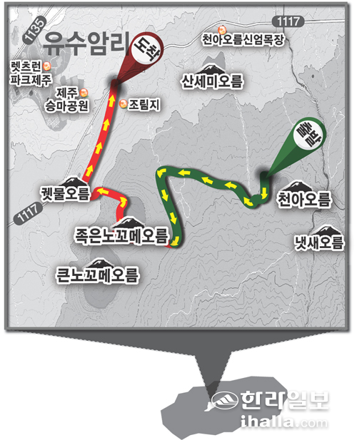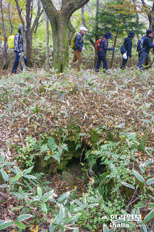 족은노꼬메오름에서는 마치 숨골처럼 보이는 갱도진지와 마주했다. 1944년 말부터 일본군이 파놓은 것이다. 미군이 상륙할 것을 대비해 만들었지만 결국 일본이 항복하면서 미완성으로 남았다. "제주 4·3 때에는 주민들이 몸을 숨겼다가 발각되어 희생당한 비극의 현장이기도 하죠." 숲 속 깊은 곳까지 파고든 전쟁의 상흔에 마음 한편이 먹먹해졌다.