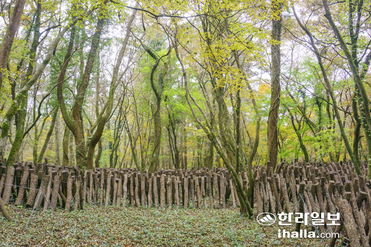 진한 가을 향기를 풍기는 숲 안으로 들어서자 통나무를 세워놓은 표고버섯 자목들이 줄지어 서 있었다. "표고버섯은 서늘하고 적당한 습기가 있는 곳에서 잘 자라죠. 한라산 해발 700m에서 1000m 사이가 가장 이상적인 조건인데요, 여기가 대략 720m 정도 됩니다." 인솔자로 나선 박훈갑 자연환경해설사의 설명이 이어졌다. 조선시대부터 진상품으로 명성이 높았던 제주 표고버섯. 하지만 1920년대 일제강점기에 들어서면서 이 명품은 수탈의 대상이 되었다. 표고버섯 자목은 상수리나무, 졸참나무 같은 참나무류를 최고로 치지만 대체목으로 서어나무도 많이 이용했다고. 당시 표고버섯 재배로 한라산 숲이 얼마나 황폐해졌을지 짐작이 갔다. 지금은 기후변화가 더 큰 고민이다. "요즘 기후가 바뀌면서 봄과 가을이 짧아져서 버섯 생산이 한 해 한 번밖에 안 되고 있어요. 인건비는 올라가는데 생산량은 줄어들어 농장들이 위기에 처해 있죠."
