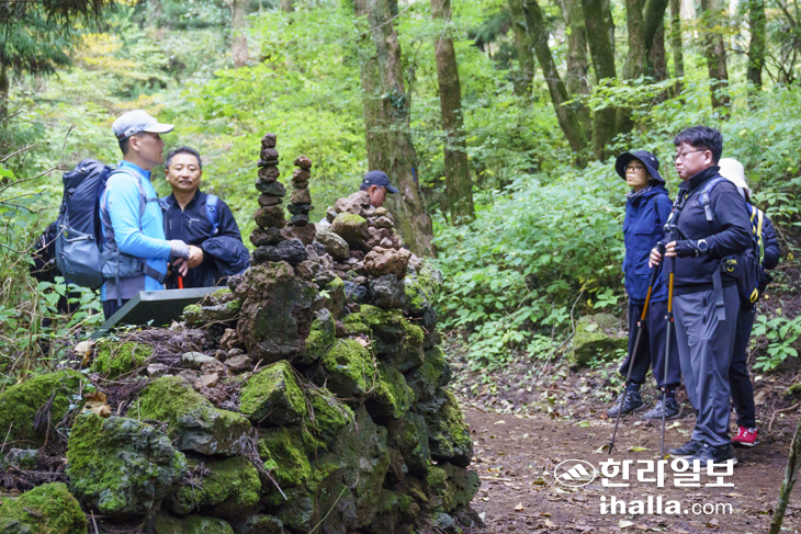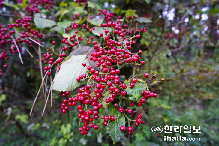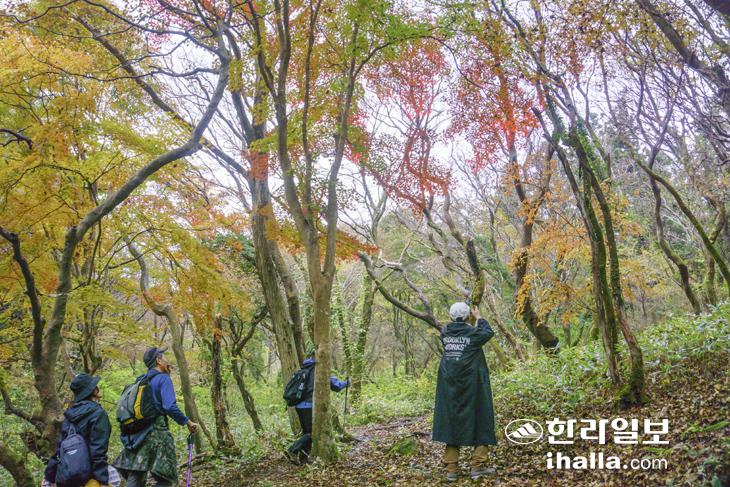 편백림을 벗어나자 이번엔 조릿대가 빼곡하게 들어선 공간이 펼쳐졌다. 제주조릿대는 육지의 조릿대와는 달리 잎 가장자리에 나타나는 하얀 줄무늬가 특징이다. 1980년대 중반부터 한라산 국립공원 보호를 위해 소나 말 방목을 금지했는데 이처럼 급속히 확산된 것이다. 조릿대는 뿌리줄기로 번식하며 촘촘하게 땅을 점령하기 때문에 다른 식물이 자랄 수 없게 만든다. 조릿대 너머로 단풍이 들기 시작한 나무들이 곳곳에 눈에 띄었다. 지속가능한 숲을 위한 대안 모색이 필요한 시점이다.