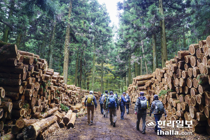 | 간벌한 목재들 사이를 걸어가는 참가자들 |