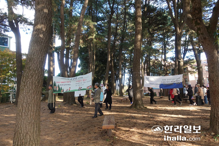 5일 오후 시민들이 '서귀포의 아들 오영훈 도지사님, 100년 곰솔숲의 지킴이로 역사에 남아주세요'란 문구가 적힌 현수막을 들고 서귀포학생문화원 소나무 숲과 그 주변을 행진하고 있다.