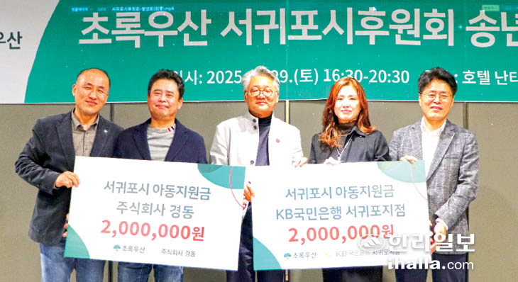 이날 송년회에서는 KB국민은행 서귀포지점(지점장 고민수)에서 서귀포시 아동지원금 200만원을 후원했으며, 주식회사 경동 고훈철 대표이사도 후원에 동참해 아동지원금 200만원을 전달했다.