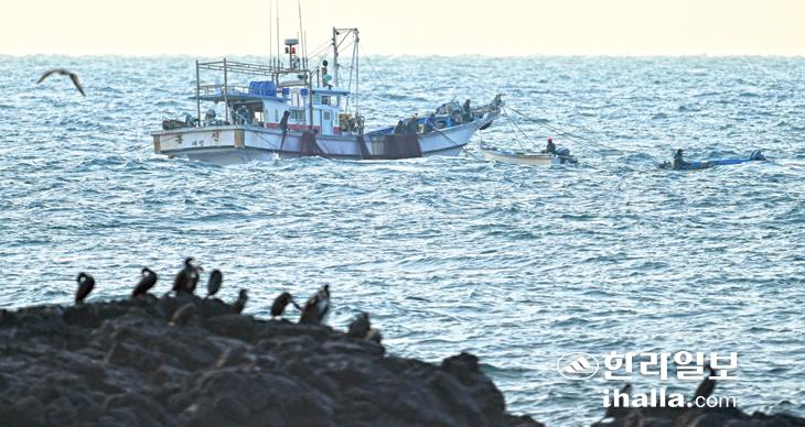 7일 서귀포시 대정읍 동일리 인근 해상에서 자리돔을 잡는 어부들이 그물을 끌어 올리고 있다. 강희만기자