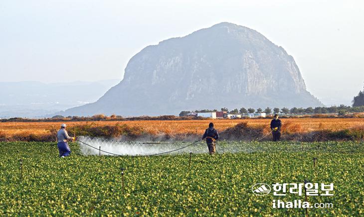 [한라일보] 7일 서귀포시 대정읍 하모리 월동무밭에서 농민들이 농약 살포작업을 하고 있다. 강희만기자