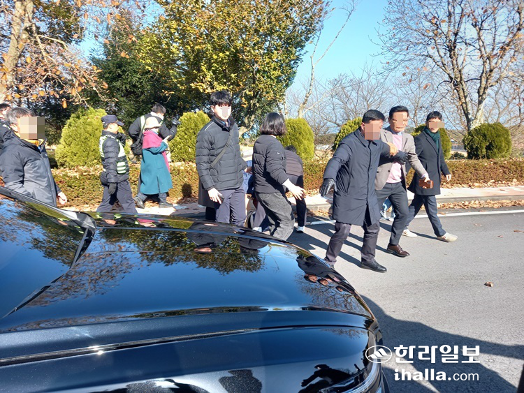 | 행사장을 떠나는 오영훈 도지사의 차를 가로막다 제지당하는 반대 측. 오소범 기자 |