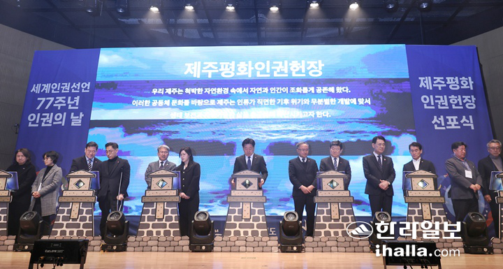[한라일보] 제주4·3의 민주주의와 평화, 인권의 가치를 바탕으로 '평화와 인권의 섬 제주'를 실현하고자 제정된 제주평화인권헌장이 10일 공식 선포됐다.