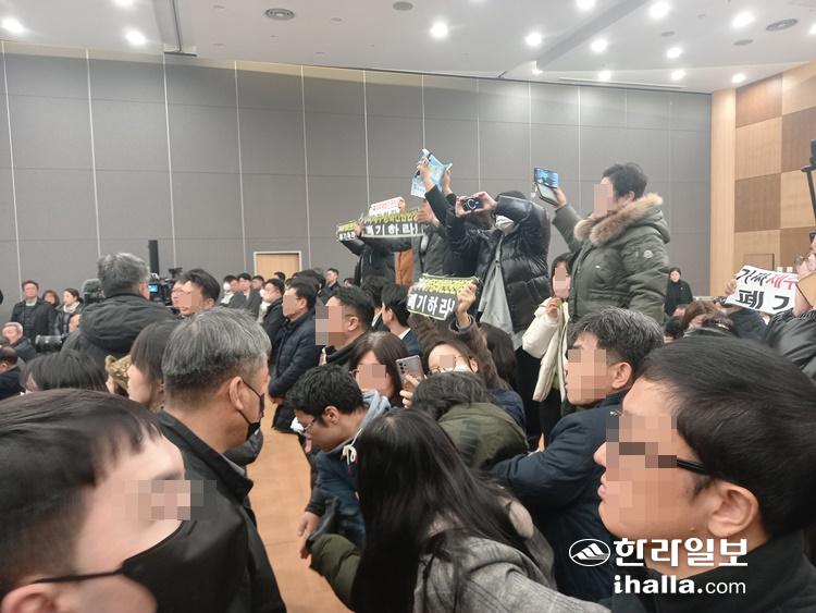 반대 측은 책상 위로 올라가거나 행사 중간 무대로의 접근을 시도했으나 공무원들로 구성된 인간띠에 가로막혔다.