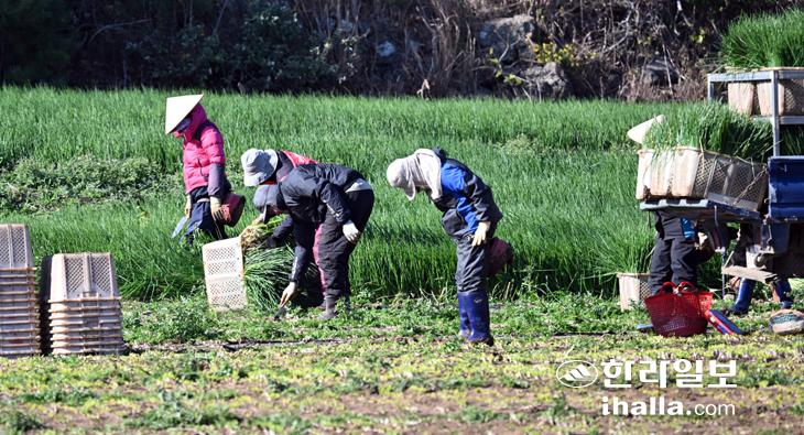 [한라일보] 10일 제주시 한경면 한 밭에서 농민들이 쪽파 수확 작업을 하고 있다. 강희만기자