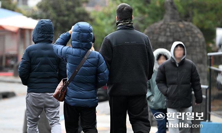 [한라일보] 강한 바람을 동반한 추위가 찾아온 14일 제주시 용두암을 찾은 관광객들이 두꺼운 옷을 입고 잔뜩 몸을 움츠린 채 주변을 둘러보고 있다. 강희만기자