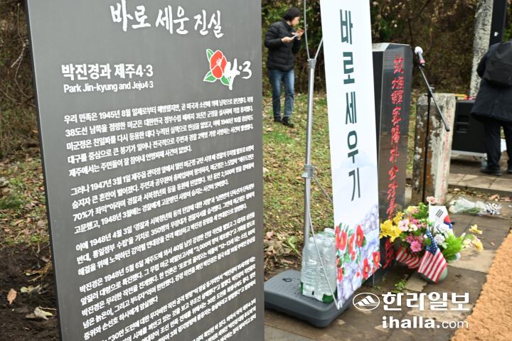 [한라일보] “4·3이 끝나지 않아 주민들이 공포에 떨고 있던 1952년에 군경원호회 명의로 세워진 ‘박진경 대령 추도비’의 내용은 일부 사실과 맞지 않는다. 또한 여전히 박진경을 미화하며 4·3을 왜곡하는 일이 벌어지고 있어 이를 바로잡고자 안내판을 세운다.”