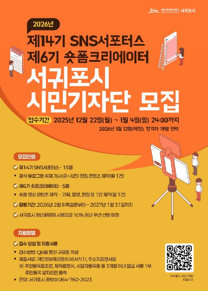 [한라일보] 서귀포시는 시민이 직접 참여하는 시정 홍보와 양방향 소통 강화를 위해 '2026 서귀포시 시민기자단(제14기 SNS서포터스·제6기 숏폼크리에이터)'을 모집한다고 17일 밝혔다. 모집 기간은 오는 22일부터 내년 1월 4일까지다.