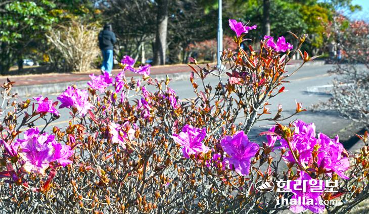 18일 제주대학교 교정에 핀 진달래가 행인들의 눈길을 끌고 있다. 강희만기자