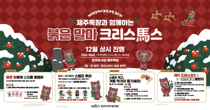 [한라일보] 한국마사회 제주목장은 2026년 붉은 말의 해를 기념해 오는 19일부터 연말까지 대고객 연말 행사 '한국마사회 제주목장과 함께하는 붉은 말마 크리스馬스' 행사를 개최한다고 밝혔다.
