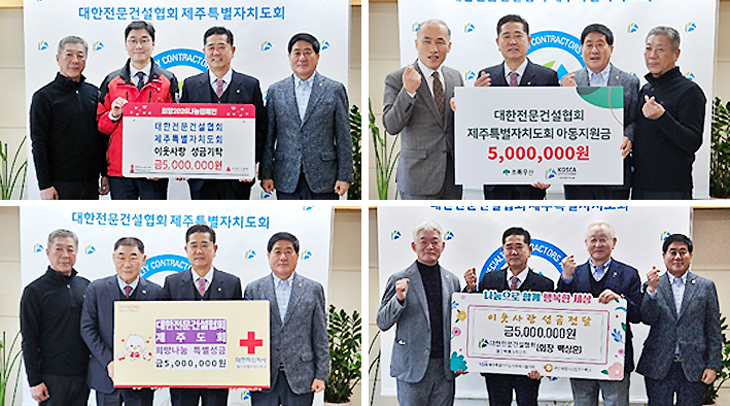 대한전문건설협회 제주특별자치도회(회장 백상훈)는 지난 18일 지역 복지단체(제주사회복지공동모금회·대한적십자사·초록우산 어린이재단·제주사회복지협의회)에 연말 불우이웃 돕기 성금 총 2000만원을 전달했다.