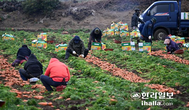 [한라일보] 21일 제주시 구좌읍 종달리 한 밭에서 농민들이 당근을 수확하고 있다. 강희만기자