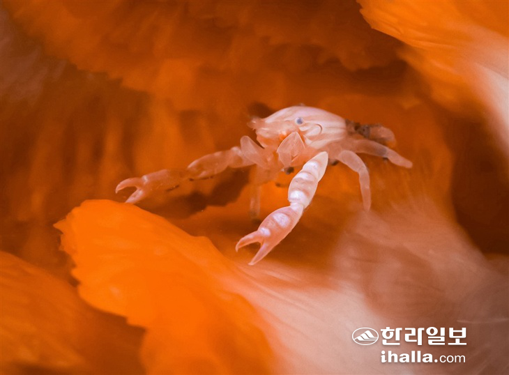 지난 4월 발견된 미기록 게붙이류는 일본을 비롯해 동남아시아의 열대·아열대 연안에 넓게 분포하는 포르셀라넬라 하이가에(Porcellanella haigae)로 확인됐다. 포르셀라넬라 속(Genus Porcellanella)은 일반적으로 바다조름류와 공생하며 넓은 붓모양의 턱다리를 이용해 플랑크톤과 유기물을 여과해 먹는 것으로 알려졌다. 이번에 확인된 개체도 모래 경사면에 군데군데 분포하는 바다조름류의 폴립 잎 사이에서 발견됐다.