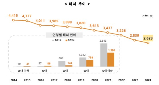 제주 해녀 인구는 2014년 이후 매해 감소세다. 2014년 4415명에서 2024년 2623명으로 1792명(40.6%) 줄었다. 연령별로는 40대 이하는 증가했지만 50대 이상은 모두 감소했으며 특히 70대 이상 감소세가 두드러졌다. 지난해 기준 해녀는 30대 이하 41명, 40대 86명, 50대 144명, 60대 758명, 70대 이상 1594명으로 2014년 대비 30대는 31명, 40대는 29명 증가한 반면 50대는 519명, 60대는 284명, 70대 이상은 1049명 각각 줄었다.
