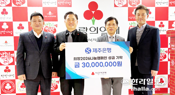 제주은행(은행장 이희수)은 최근 제주사회복지공동모금회(회장 강지언)가 주관하는 '희망2026 나눔캠페인'에 이웃사랑 성금 3000만원을 전달했다.