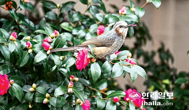 [한라일보] 23일 제주시 한 주택가에 심어진 애기동백꽃에 직박구리 한마리가 날아와 꽃잎을 물고 주변을 살피고 있다. 강희만기자