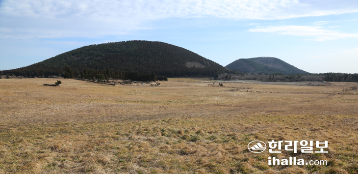 왼쪽 부대오름과 오른쪽 부소오름. 인접했지만 형태가 대조적이다. 사진 김찬수