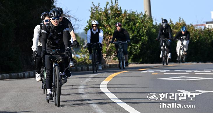 [한라일보] 29일 서귀포시 대정읍 서일주도로에서 자전거를 이용해 도일주에 나선 라이더들이 힘차게 질주하고 있다. 강희만기자