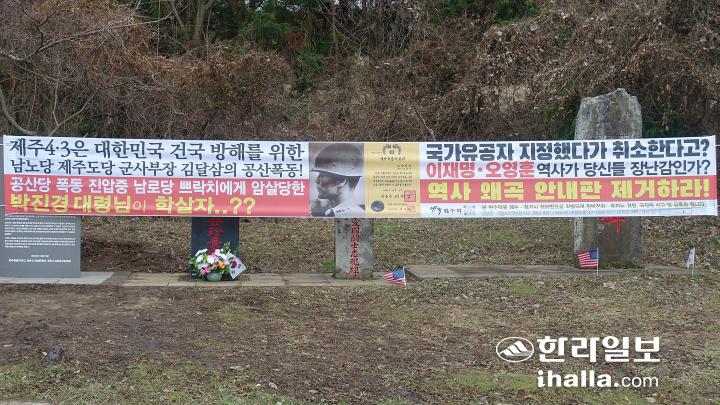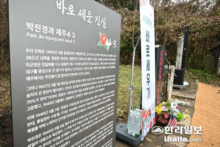 [한라일보] 제주4·3 당시 강경진압을 주도했던 고(故) 박진경 대령의 추도비 ‘바로 세운 진실의 비’가 세워졌으나 이를 모두 가리는 4·3왜곡 현수막이 보름이 채 되지 않은 시점에 설치된 것으로 드러났다.