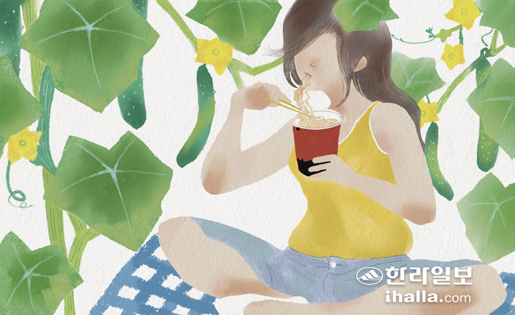 언젠가부터 오이를 먹으면 목 안쪽이 따가웠다. 호흡 곤란이 와 죽을 정도로 심한 증상이 있는 건 아니었으나 컨디션이 좋지 않을 때는 수포가 올라와 얼굴이 뒤집어졌다. 나는 보기만 해도 가려움이 느껴지는 오이를 한껏 노려보다가 찬장에서 컵라면을 꺼냈다. 밥상머리에 죽상으로 앉아 물에 만 밥을 먹느니 차라리 방에 들어가 혼자 먹는 게 나을 것 같았다.