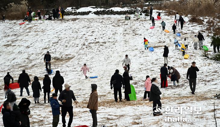 [한라일보] 3일 제주시 산록도로 인근 목초지에서 도민과 관광객들이 눈썰매를 타며 즐거운 시간을 보내고 있다. 강희만기자