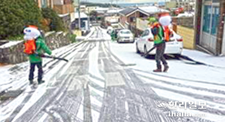 제주시 화북동지역자율방재단(방재단장 박재덕)은 지난 2일 지역 내 급경사 도로와 경사로 결빙 구간을 중심으로 제설작업을 벌여 차량과 보행자의 안전한 통행을 도왔다.