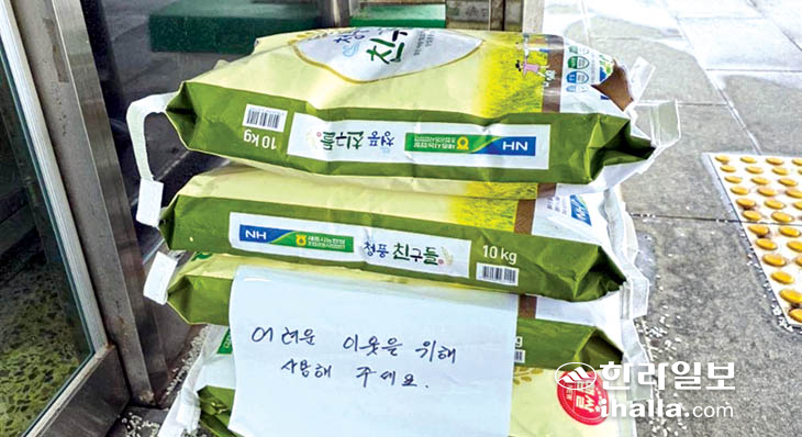 제주시 조천읍(읍장 김성수)은 지난 2일 읍사무소 앞에 익명의 독지가가 쌀 50㎏을 '어려운 이웃을 위해 사용해 주세요'라는 메모와 함께 놓고 갔다고 5일 밝혔다. 조천읍은 기부자의 의사를 고려해 신원 확인은 하지 않기로 했다.