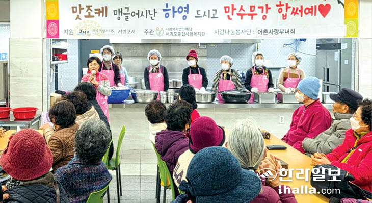 서귀포수협어촌사랑부녀회(회장 김옥희)는 지난 3일 서귀포종합사회복지관 경로식당을 찾아 지역 어르신 300여 명에게 점심식사를 지원했다.