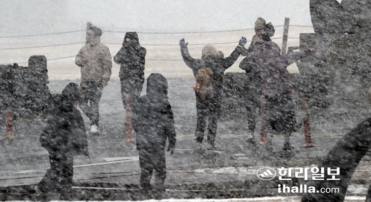 [한라일보] 11일 서귀포시 성산읍 성산일출봉을 찾은 관광객들이 거센 눈보라를 맞으며 걸어가고 있다. 강희만기자