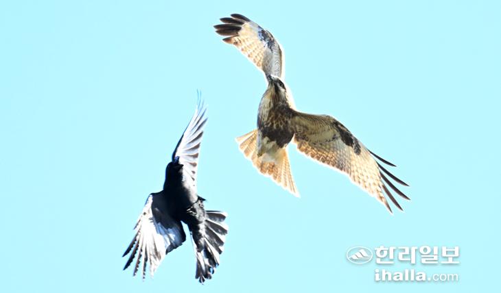[한라일보] 13일 제주시 아라동 상공에서 말똥가리와 큰부리까마귀가 영역 다툼을 하고 있다. 강희만기자