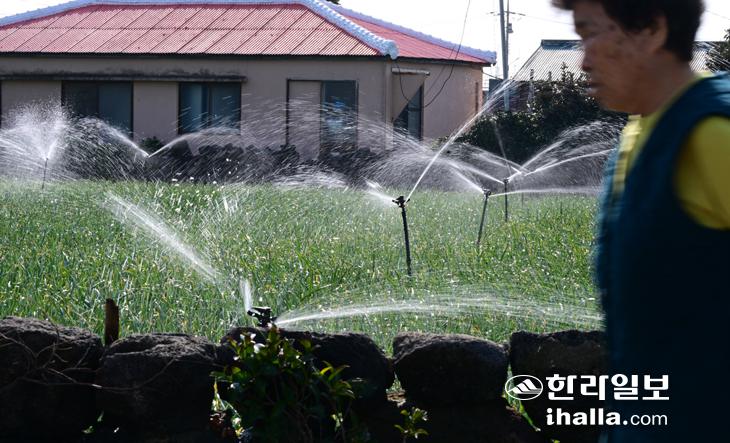 [한라일보] 14일 제주시 한경면 고산리의 마늘밭에서 스프링클러가 분주히 돌아가며 생명수를 공급하고 있다. 강희만기자