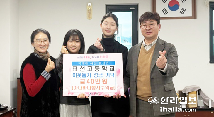 표선고등학교는 지난 13일 본교에서 서귀포시 표선면(면장 문철환)에 아나바다 장터 수익금 40만원을 기탁했다. 기탁금은 표선면 희망나눔캠페인 특화사업인 '행복나눔 희망마켓' 운영에 사용될 예정이다.
