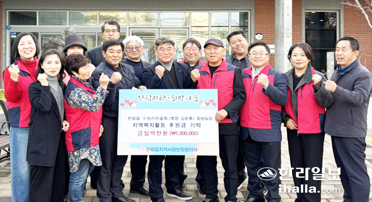 제주시 한림읍 수원리마을회(회장 김윤홍) 회원 일동은 지난 12일 지역 내 복지사각지대 이웃들에게 사용해 달라며 후원금 100만원을 한림읍지역사회보장협의체(공동위원장 고석건·함동윤)에 기탁했다.