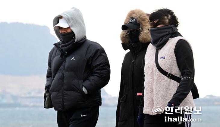 [한라일보] 다시 매서운 추위가 찾아온 19일 제주시 구좌읍 종달리를 찾은 관광객들이 강한 바람을 피하려 몸을 움츠린 채 걸어가고 있다. 강희만기자