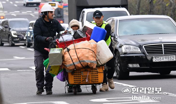 [한라일보] 19일 오전 제주시 오라동의 가파른 오르막길에서 재활용품이 가득 실린 한 어르신의 수레를 청년들이 함께 밀어주고 있다. 강희만기자