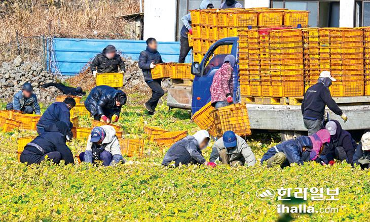 [한라일보] 19일 서귀포시 표선면 성읍리 한 농경지에서 농민들이 월동무를 수확하고 있다. 강희만기자