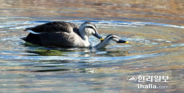 [한라일보] 20일 제주시 외도천에서 흰뺨검둥오리들이 종 번식을 위해 짝짓기를 하고 있다. 강희만기자