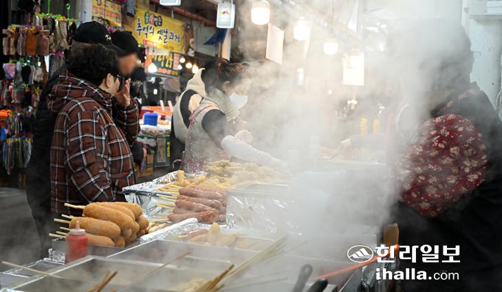 [한라일보] 강추위가 내습한 22일 제주시민속오일장 내 어묵·옥수수 좌판에서 김이 모락모락 피어오르고 있다. 강희만기자