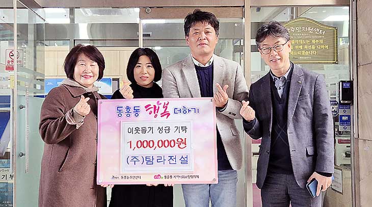 탐라전설(주)(대표 윤희금)는 지난 20일 서귀포시 동홍동 주민센터(동장 김철식)를 방문해 어려운 이웃들을 위해 써달라며 성금 100만원을 기부했다.