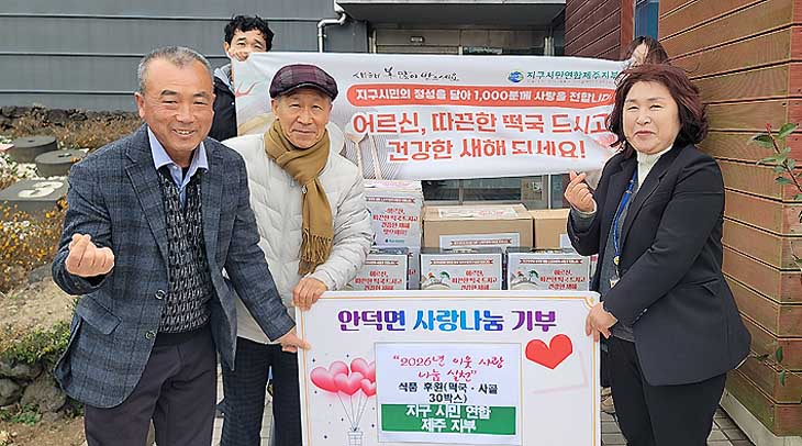 지구시민연합 제주지부(대표 신선영)는 지난 20일 서귀포시 안덕면(면장 김태유)을 방문해 홀로 사는 어르신들의 겨울나기를 위한 떡국 30박스를 전달했다.