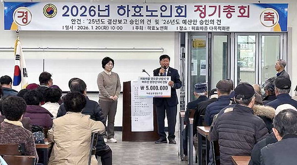 [한라일보] 서귀포시 하효살롱(대표 김미형)은 지난 20일 하효노인회(회장 이석하) 정기총회장을 방문해 하효경로당 난방비 및 어르신 간식비 500만원을 전달했다.