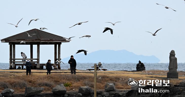 [한라일보] 26일 제주시 구좌읍 행원리 해안가를 찾은 관광객들 너머로 전라남도 완도군 여서도가 손에 잡힐 듯 선명하게 보이고 있다. 강희만기자