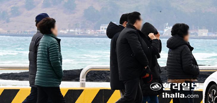 제주 찬바람에 잔뜩 움츠린 관광객들