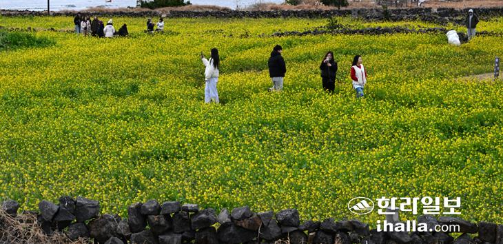유채꽃밭서 제주의 겨울 즐기는 관광객들