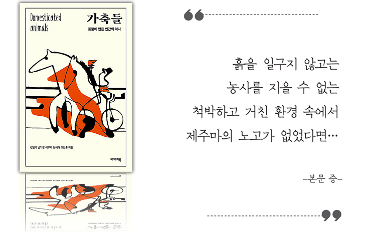 김일석·남기창·이무하·장애라·조철훈 등 동물과 축산산업 연구자들이 펴낸 '가축들'의 일부 내용이다. 이들은 제주마의 이야기를 전하며 "흙을 일구지 않고는 농사를 지을 수 없는 환경 속에서 제주마의 노고가 없었다면 어땠을까"라는 질문을 던진다. 이에 이들은 "모르긴 몰라도, 옛 제주 사람들의 삶은 훨씬 더 고단했을 것"이라고 전한다.
